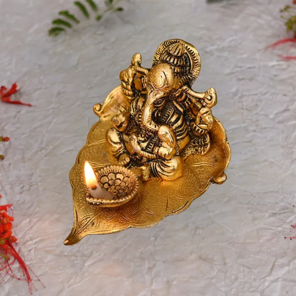 Gold Lord Ganesh Sitting On Leaf With Diya Decorative Showpiece